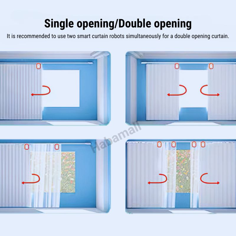 Dual curtain opening means the curtains can open from the center and move to both sides, perfect for larger windows with two curtain panels.